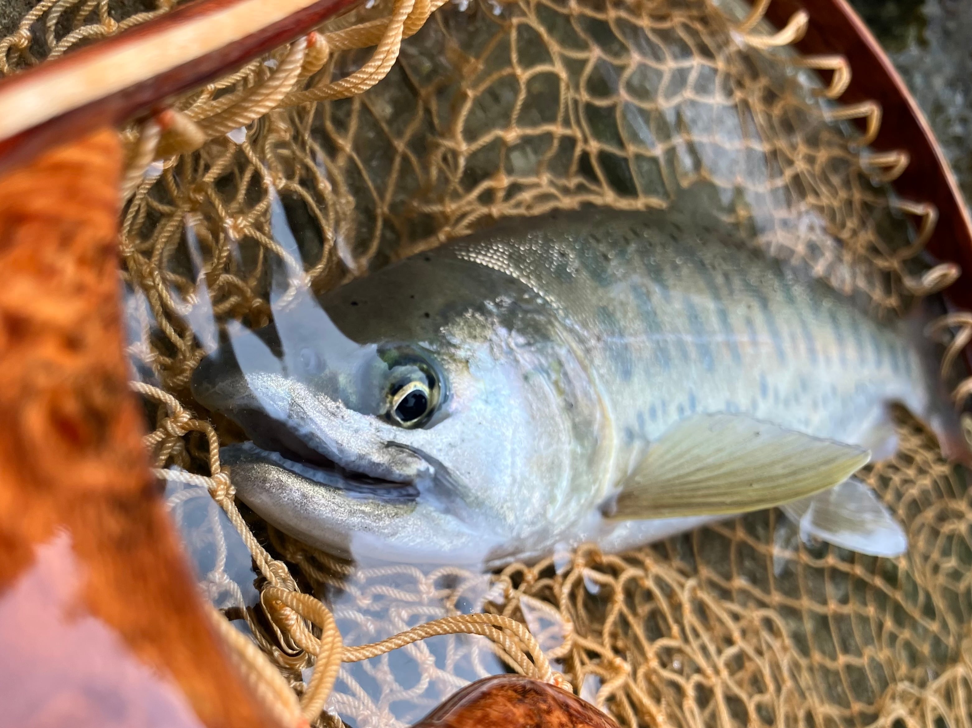 ハンドメイド ランディングネット【小渓流向け】 唯一無二の斬新なデザイン。 フレーム幅をあえて狭く設計しており、ネットインをハードモードにする一方、 綺麗な渓魚を収める額としては面白い個性的なネットです。 使い込むごとに味わいが増すこだわりの一品です。 スペック 全長:51センチ 内径:36×12センチ グリップ材:ブビンガ フレーム材:ウォールナット、メープル 網:クレモナ(グリーン)、深さ約35cm オイルフィニッシュ仕上げ