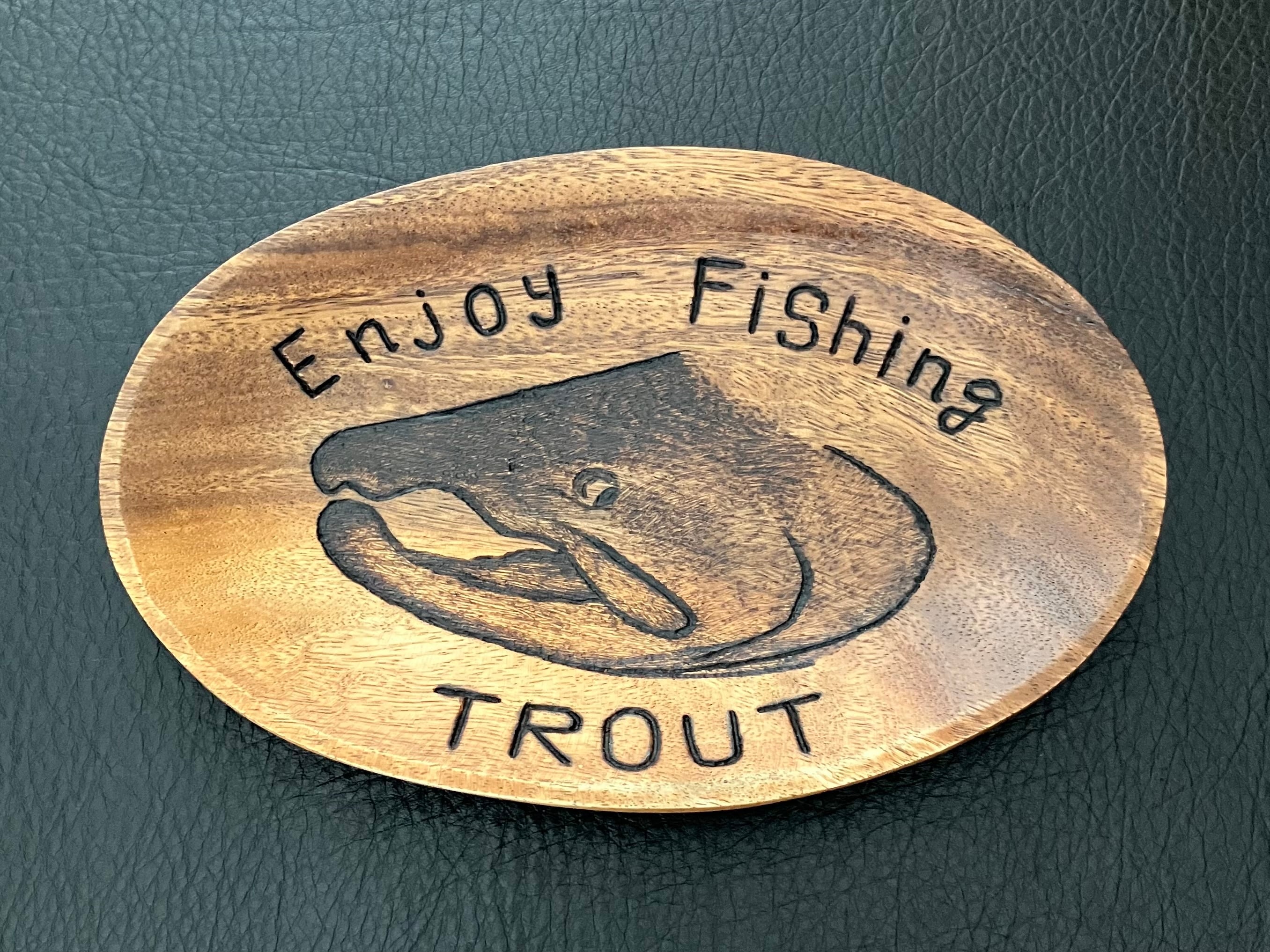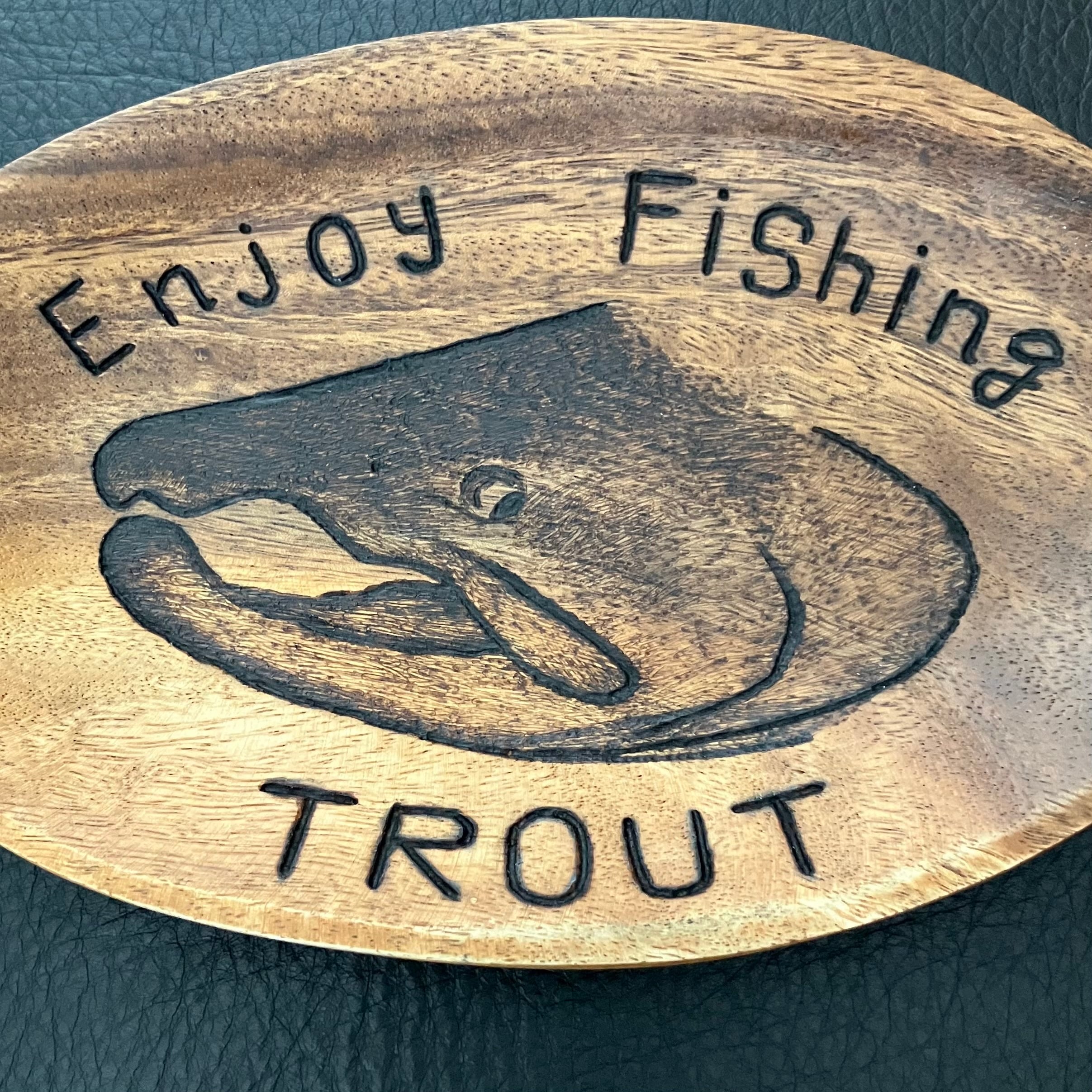 木材(アカシア)に、イワナのフェイスデザインを施しています。