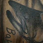 木材(アカシア)に、イワナのフェイスデザインを施しています。